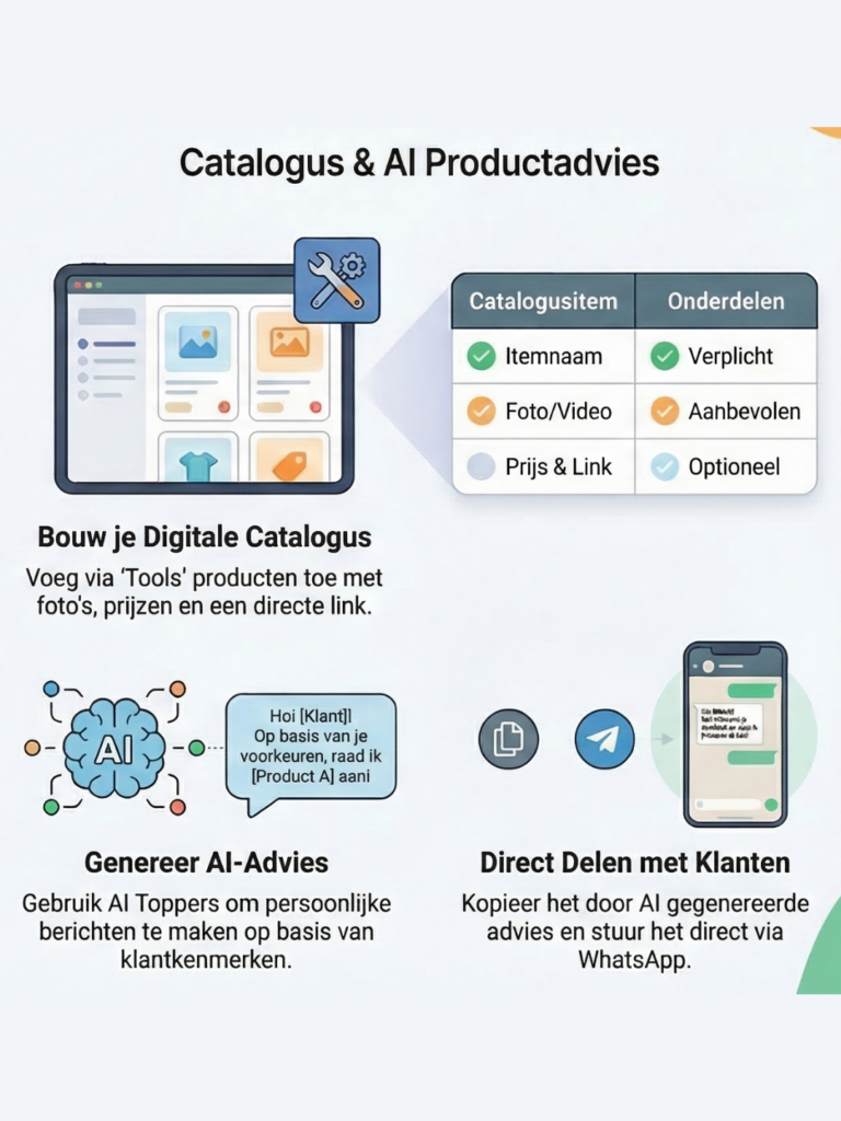 Je vindt hier een gedetailleerd stappenplan voor ondernemers om je persoonlijke WhatsApp-account succesvol om te zetten naar WhatsApp Business. Er wordt uitgebreid aandacht besteed aan essentiële voorbereidingen, zoals het maken van een reservekopie en het verifiëren van je telefoonnummer om je chatgeschiedenissen te behouden. Daarnaast legt de handleiding uit hoe je een professioneel bedrijfsprofiel en een digitale catalogus met producten of diensten inricht. Een bijzonder onderdeel is de integratie met AI Toppers, een systeem dat gebruikmaakt van ChatGPT om gepersonaliseerde productadviezen voor klanten te genereren. Je leert hoe je deze AI-technologie koppelt aan je catalogus om automatisch professionele verkoopberichten te schrijven.